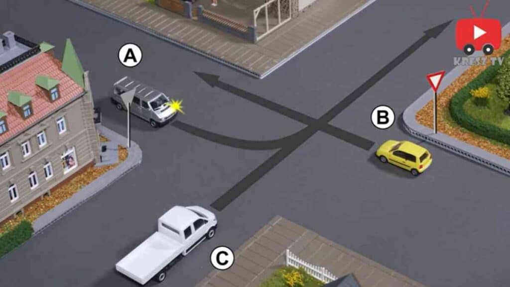 A képen három autó egyszerre közelít egy útkereszteződéshez,és azt kell eldönteni, hogy ki haladhat át elsőként, majd ki követi és végül ki az utolsó. Nem bonyolult, azonban alaposan meg kell nézni, hogy ki merre tart: ugyanis a B jelű autó egyenesen haladna tovább, ahogyan a neki bal kézre eső C jelű autó is, viszont a B jelű kisbusz pedig nagy ívben kanyarodna balra, vagyis felhajtana a védett útra egy mellékútról. A kérdés tehát így hangzik: mi a helyes áthaladási sorrend?
