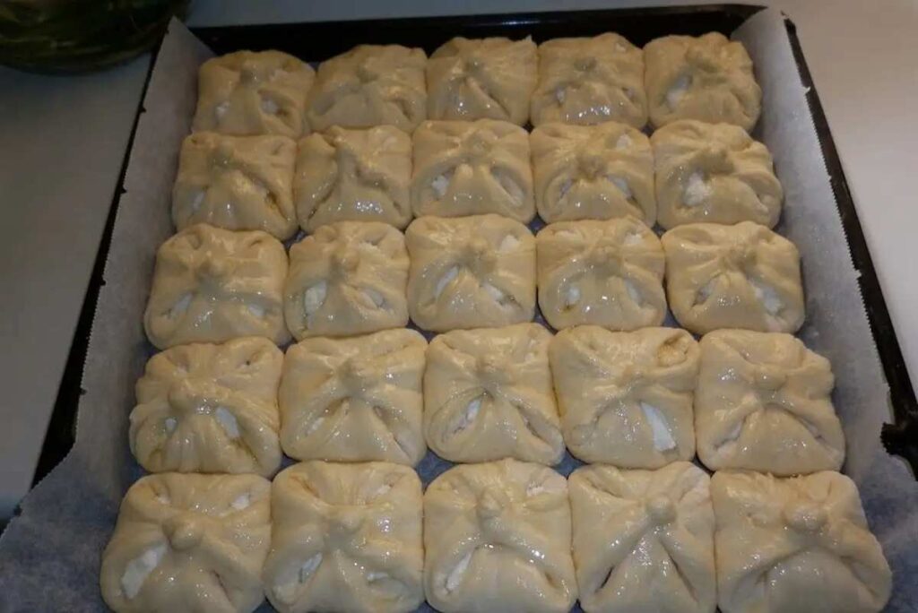 A megkelt tésztát enyhén lisztezett felületen ujjnyi vastagra nyújtjuk, majd 8×8 cm-es négyzetekre vágjuk. Minden négyzet közepére teszünk egy evőkanál túrós tölteléket, majd a tészta négy sarkát összehajtjuk, és óvatosan összecsípjük.
