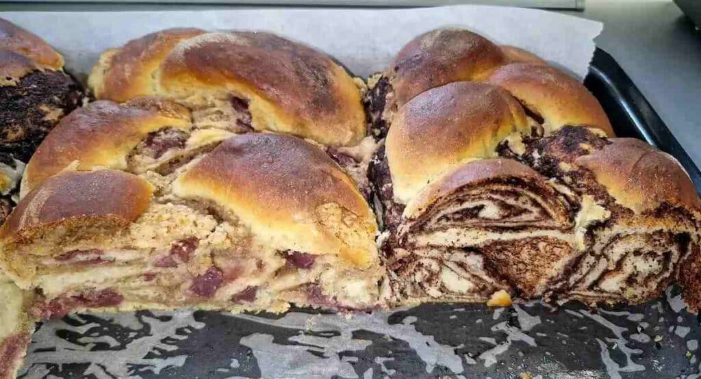A megkelt tésztát borítsd lisztezett felületre, és oszd három cipóra. Egyenként nyújtsd ki téglalap alakúra. Kend meg a tésztát a kakaós krémmel, majd csepegtess rá a vaníliás–citromos keverékből is. Szórd meg a meggyel vagy mazsolával, majd tekerd fel, mint egy bejglit. Helyezd a tekercseket sütőpapírral bélelt tepsibe, takard le, és hagyd további 15–20 percet pihenni.