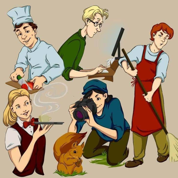 A feladvány első ránézésre egy nyüzsgő életképet mutat: van itt szorgoskodó szakács, számítógép előtt görnyedő irodista, serényen takarító alak, sőt még egy éhes mókus is feltűnik a színen. A te feladatod az, hogy ezen a tarka társaságon végigtekintve azonosítsd az egyetlen személyt, aki balkezes. Az óra kíméletlenül ketyeg, és mindössze 15 másodperced van rá, hogy bizonyítsd: semmilyen apró részlet nem kerülheti el a figyelmedet.