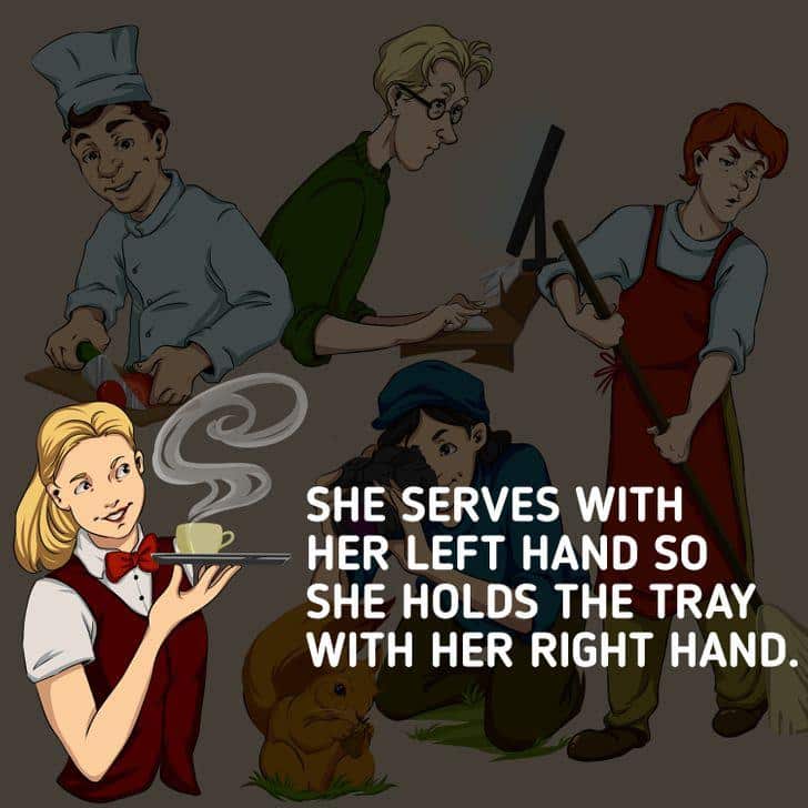 A titok nyitja a kávét felszolgáló pincérnőnél keresendő. Bár a tálcát a jobb kezén egyensúlyozza, ez egy tipikus szakmai fogás: a pincérek ugyanis a nem domináns kezükön tartják a súlyt, hogy a „ügyesebb” kezük szabadon maradjon a precíz kiszolgáláshoz. Mivel a hölgy a bal kezével nyúl a csészéért, hogy az asztalra tegye, kétség sem férhet hozzá: ő a keresett balkezes! Ha sikerült a megadott időn belül rájönnöd erre az összefüggésre, akkor a logikai érzéked és a megfigyelőképességed is átlagon felüli. Gratulálunk!