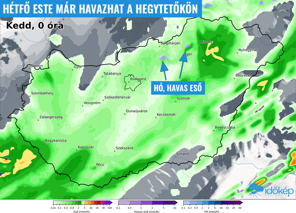 Az esti, késő esti órákban az érkező fagyos légtömeg átfedésbe kerülhet a távozó csapadékmezővel, így a magasabb hegycsúcsokon havas eső, havazás válthatja az esőt.