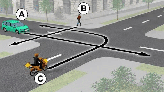 Ha csak a járműveket nézzük, a helyzet látszólag tiszta. Gyalogos nélkül a jobbkéz szabály alapján először a C jelű motoros mehetne, majd az A jelű személyautó következne.