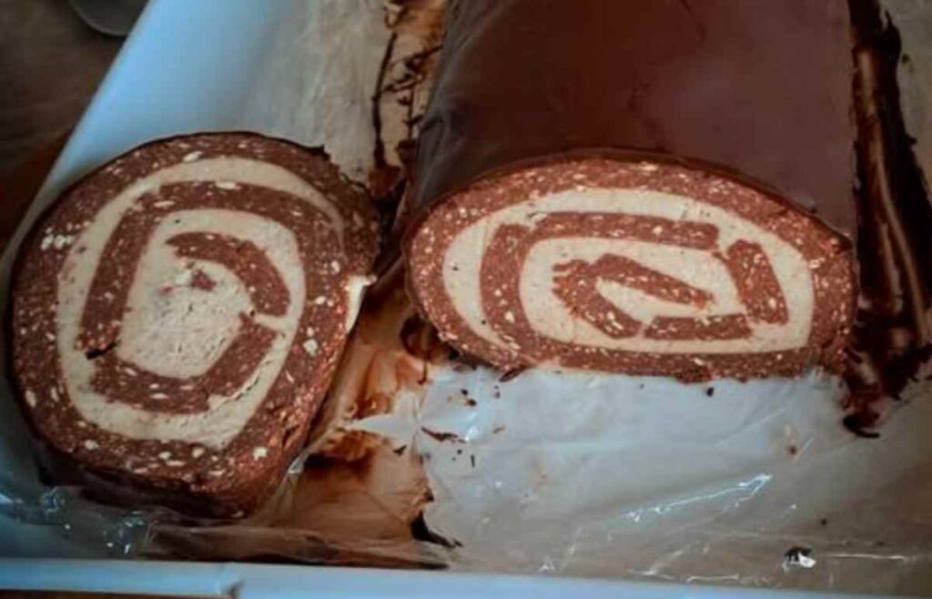 A tetejére a csokoládét gőz felett megolvasztom, majd hozzákeverem az étolajat – ettől a csoki nem lesz túl kemény, később könnyebb szeletelni. A mázat lassan ráöntöm a tekercsre, elsimítom, majd ismét a hűtőbe teszem. Másnap gyönyörűen szeletelhető, és minden íz jól kivehető: a keksz alap nem túl édes, a gesztenye krémes és elegáns, a csokoládé pedig finoman lezárja az egészet.