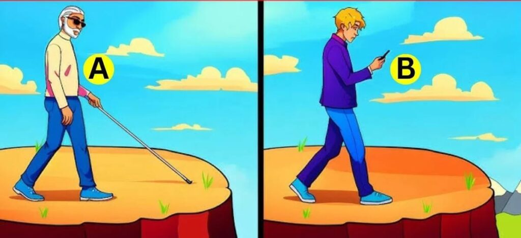 Ez a teszt is erre épít. Nem számolni kell, nem műveltségi kérdésre válaszolni, hanem gyorsan átlátni egy helyzetet. A képen két férfi látható egy szakadék közelében, és a kérdés egyszerűnek tűnik: melyikük van nagyobb veszélyben?