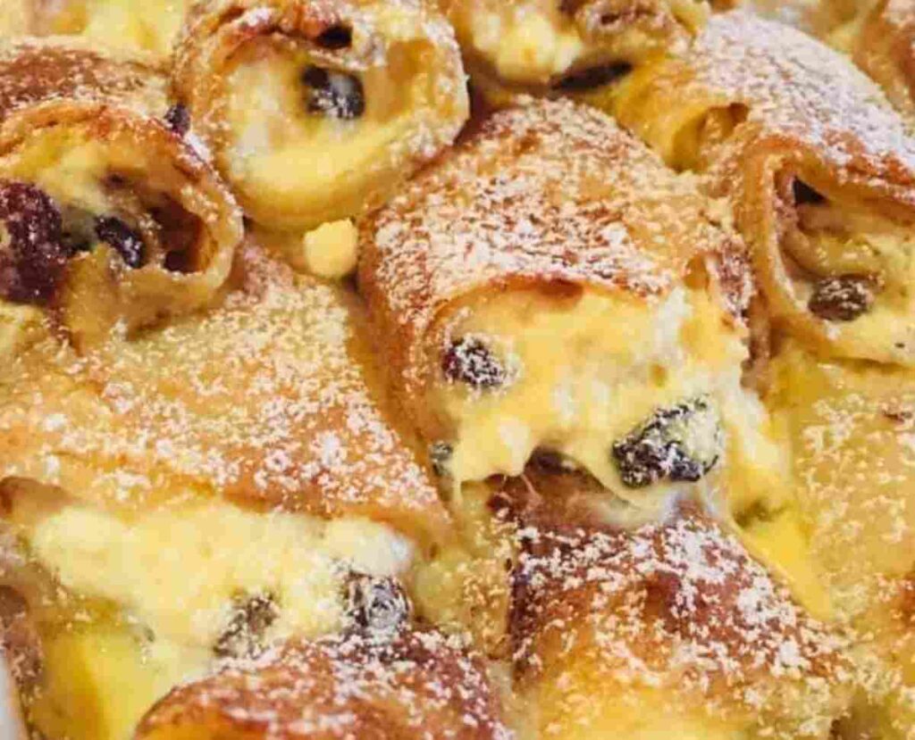 A palacsintákat megtöltjük a krémmel, feltekerjük, majd félbevágjuk. Egy kivajazott sütőtálba egymás mellé, kissé megdöntve fektetjük őket, szinte egymásnak támaszkodva.
