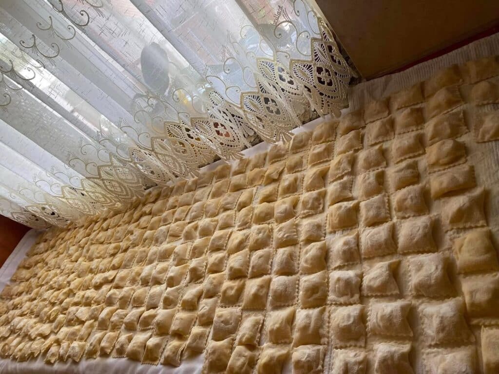 A lisztet egy gyúródeszkára vagy tálba szitáljuk, a közepébe mélyedést készítünk, majd beleütjük a tojásokat. Hozzáöntünk egy kevés langyos vizet, és rugalmas, könnyen kezelhető tésztát gyúrunk belőle. Addig dolgozzuk, amíg már nem ragad a kezünkhöz.