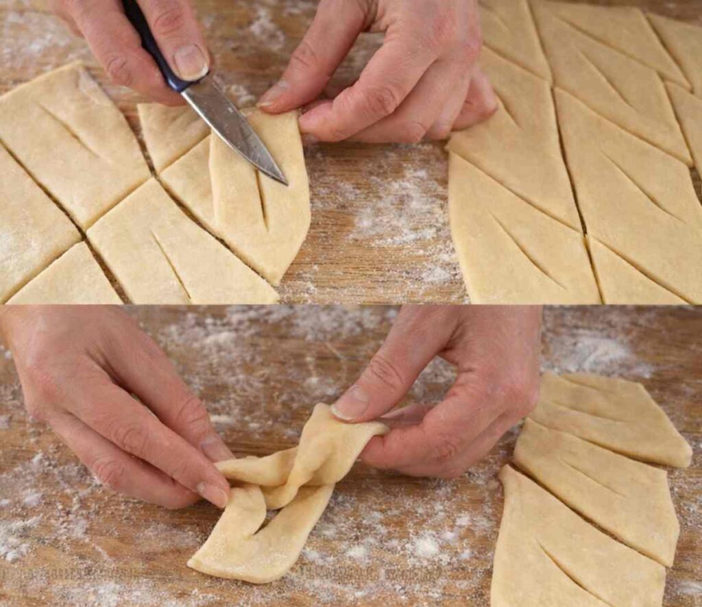 A kinyújtott tésztát rombuszokra vágjuk. Mindegyik közepébe egy kis metszés kerül, ezen a nyíláson átbújtatjuk az egyik sarkát. Ettől kapja meg azt a jellegzetes formát, amit már messziről fel lehet ismerni.