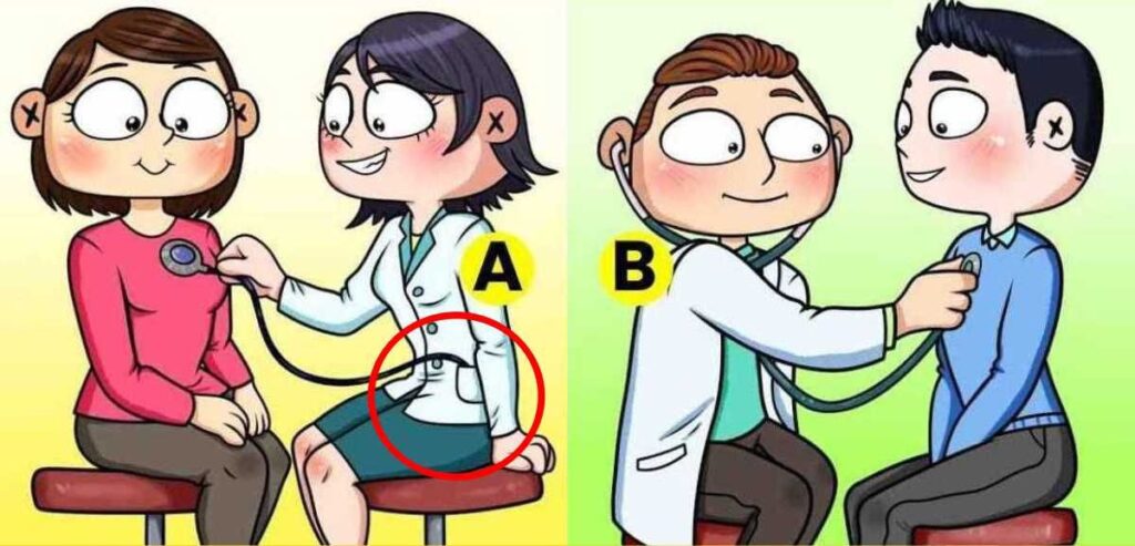 Az „A” személy a hamis orvos, ugyanis ha megnézed a képet láthatod, hogy a sztetoszkóp vége a zsebében van és nem a fülében, mint a másik „tényleges”orvosnak.