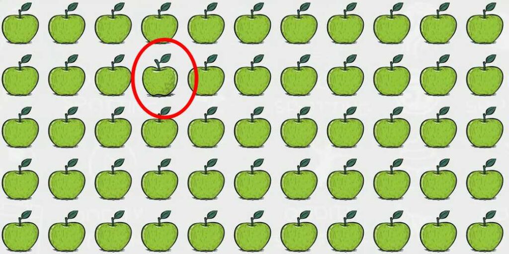 Most egy olyan fantasztikus IQ-tesztet hoztunk el neked, amely a látásodat és a gyors észlelésedet is próba elé állítja. Egy optikai illúziót láthatsz a képen, amelyen a rengeteg zöld színű alma között elbújik egy más kinézetű „kakukktojás” alma. Az a feladat most ebben az almás feladványban, hogy a lehető leggyorsabban megtaláld ezt az egyet, amely különbözik valamiben a többi almától.