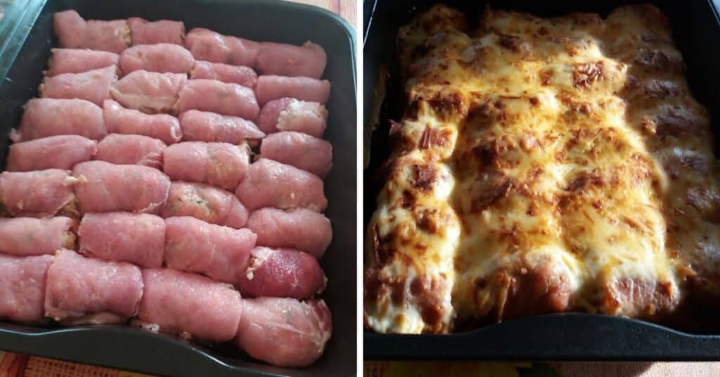 A hússzeletek közepére egy adag tölteléket teszek, majd szorosan feltekerem őket. A tekercseket egy kizsírozott tepsibe sorakoztatom, lefedem alufóliával, és 170 °C-ra előmelegített sütőben kb. 2–2,5 órán át sütöm. Vizet nem adok alá, mert a hús saját levet enged, ami később aranyat ér.