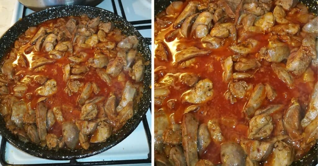 Megszórom delikáttal, majoránnával, borssal és pirospaprikával. Vizet nem adok hozzá, mert a máj és a hagyma saját levet enged. Sűrűn kevergetve, saját zsírjára pirítom, amíg a máj teljesen átsül.
