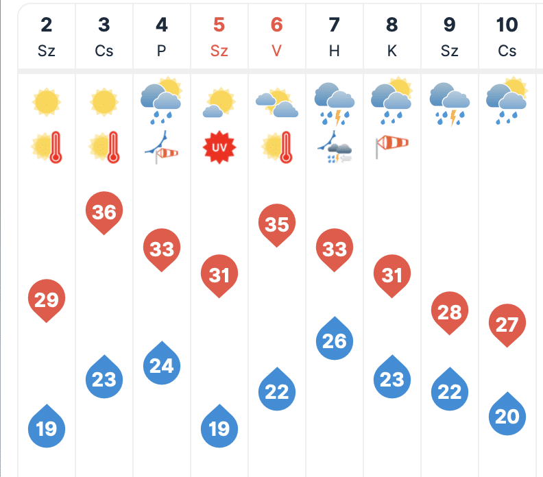 Vasárnap a fátyol- és gomolyfelhők mellett sok napsütésre számíthatunk. Nagyobb eséllyel az északnyugati tájakon fordulhat elő zápor, zivatar. A délire, délnyugatira forduló szél nagy területen megélénkül, olykor megerősödik. A hajnali 14, 23 fokról délutánra 30, 38 fok közé emelkedik a hőmérséklet.