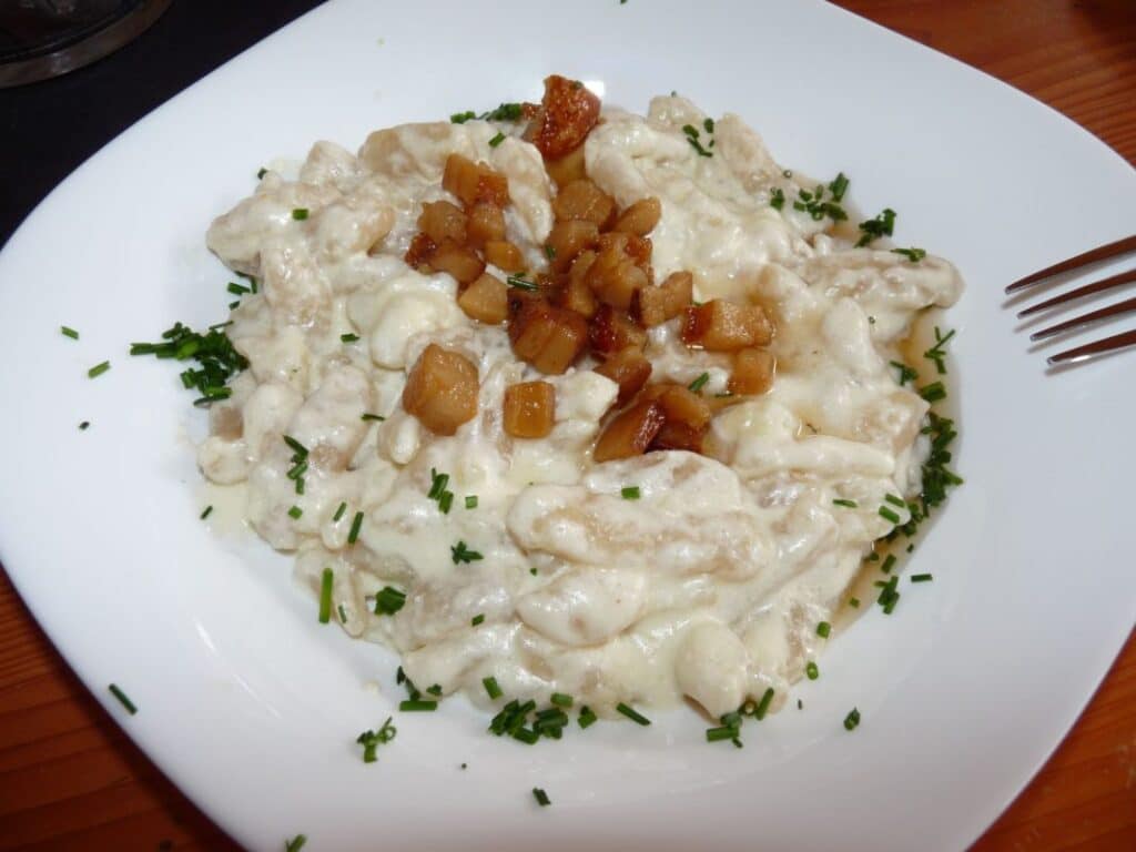 Szűrőkanállal kiszedem, alaposan lecsurgatom, majd beleforgatom a füstölt szalonna forró zsírjába. Rászóróm a zsíros, enyhén csípős juhtúrót, és óvatosan összeforgatom.