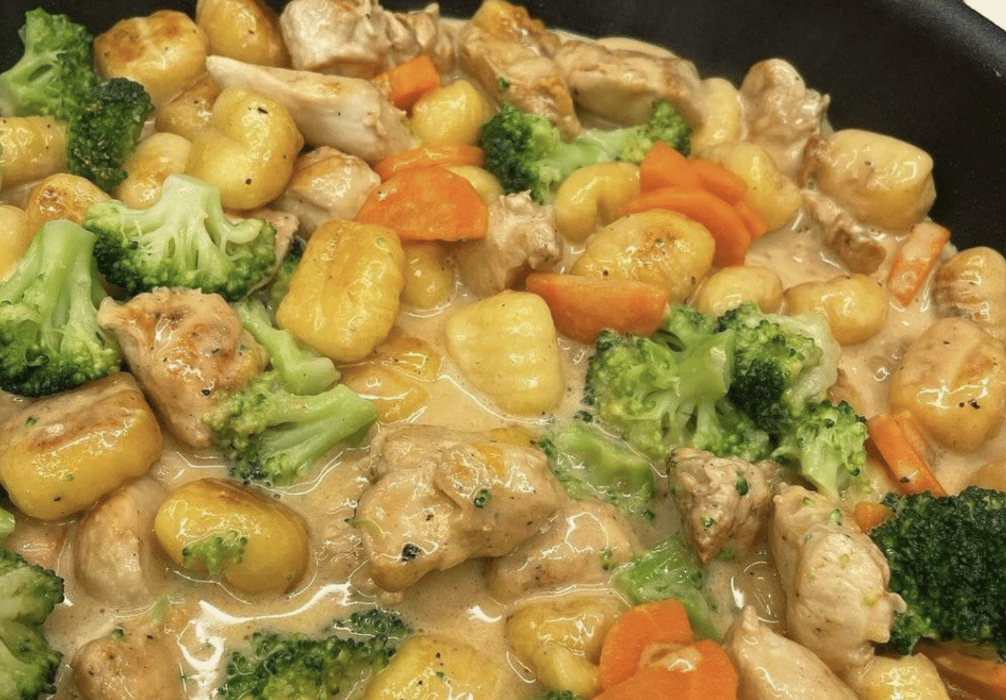 A hús néhány perc alatt aranybarnára sül. Ekkor kerülnek bele a zöldségek, amelyek pár perc pirítás után még enyhén roppanósak maradnak. A tejszín összefogja az egészet, krémes mártást képez a serpenyő alján.