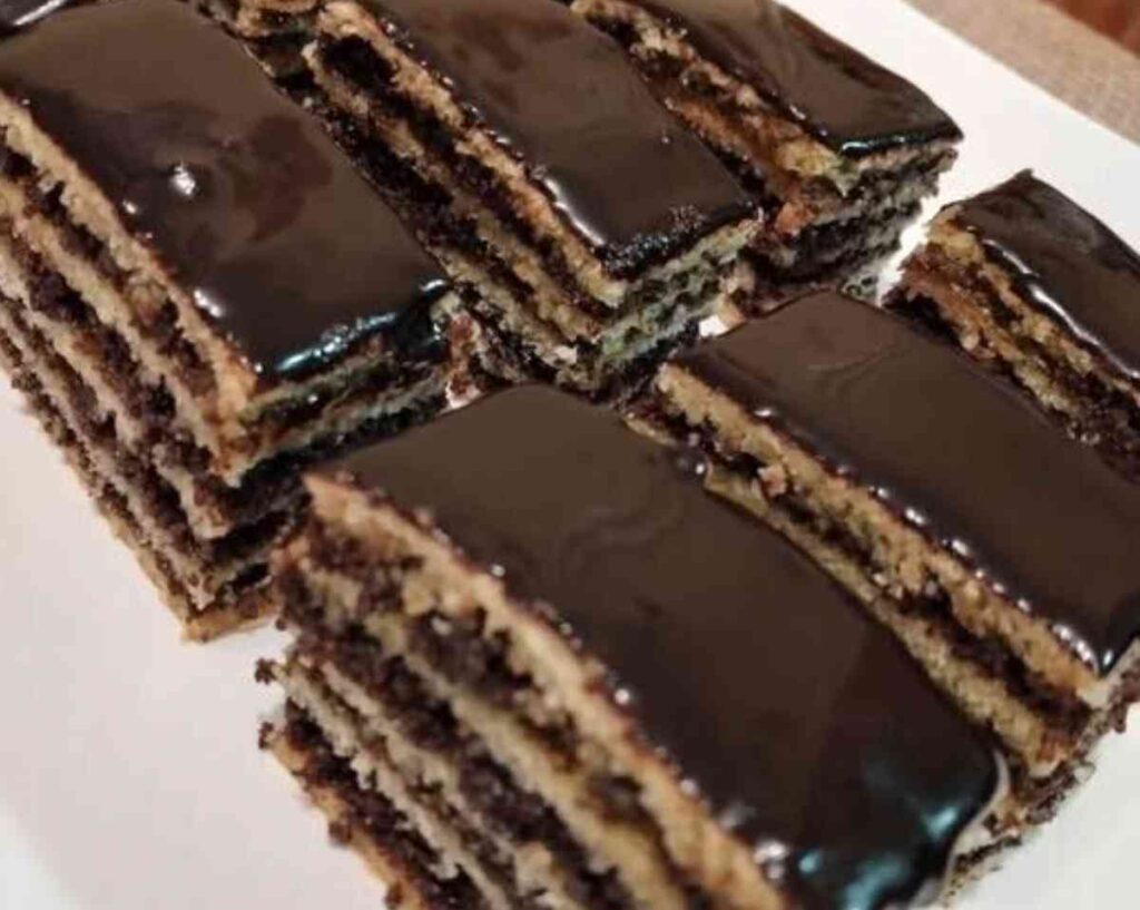 Amikor a sütemény teljesen kihűlt, a tetejére olvasztott étcsokoládé kerül. Ez a réteg nemcsak látványos, hanem ízben is szépen lezárja a desszertet. A csokoládé megszilárdulása után lehet szeletelni, és ilyenkor látszik igazán a rétegek váltakozása.
