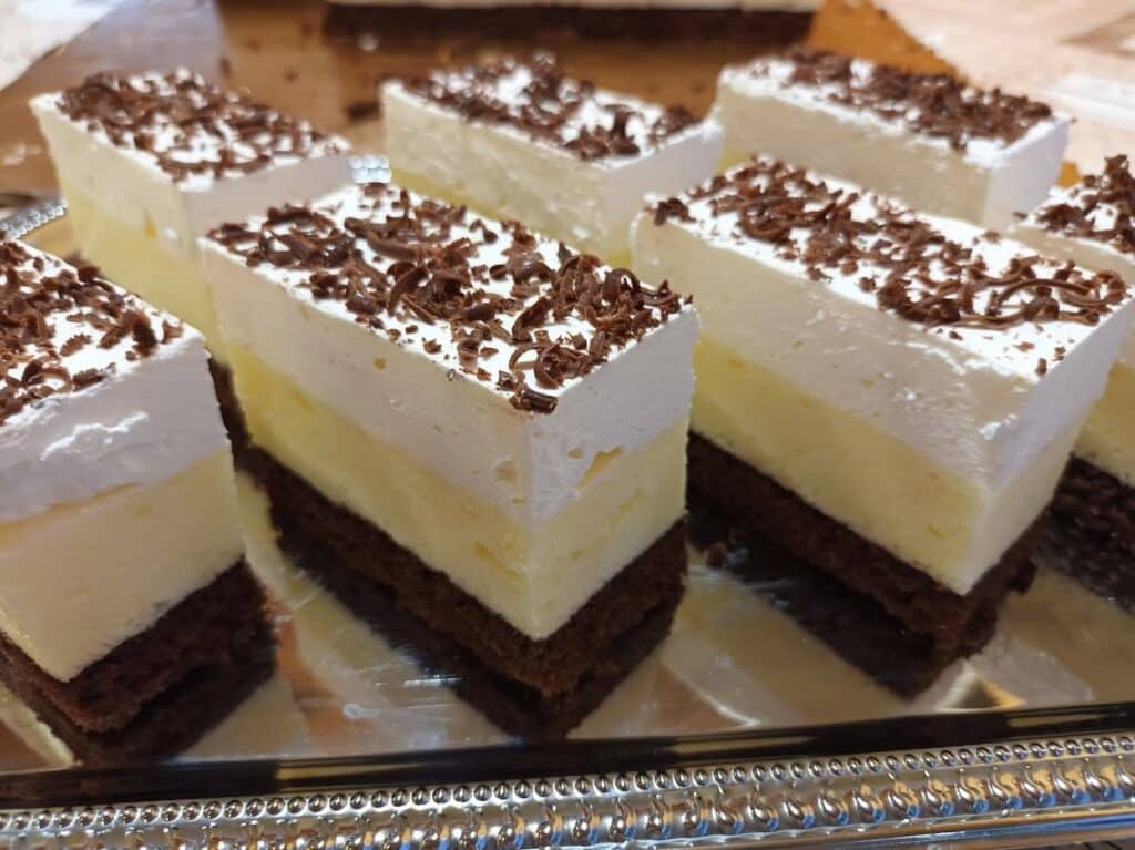 Amikor már teljesen kihűlt, felvert tejszínhabbal megkenem a tetejét, majd reszelt csokoládéval megszórom. Szeletelés előtt érdemes még egy kicsit hűtőben pihentetni.