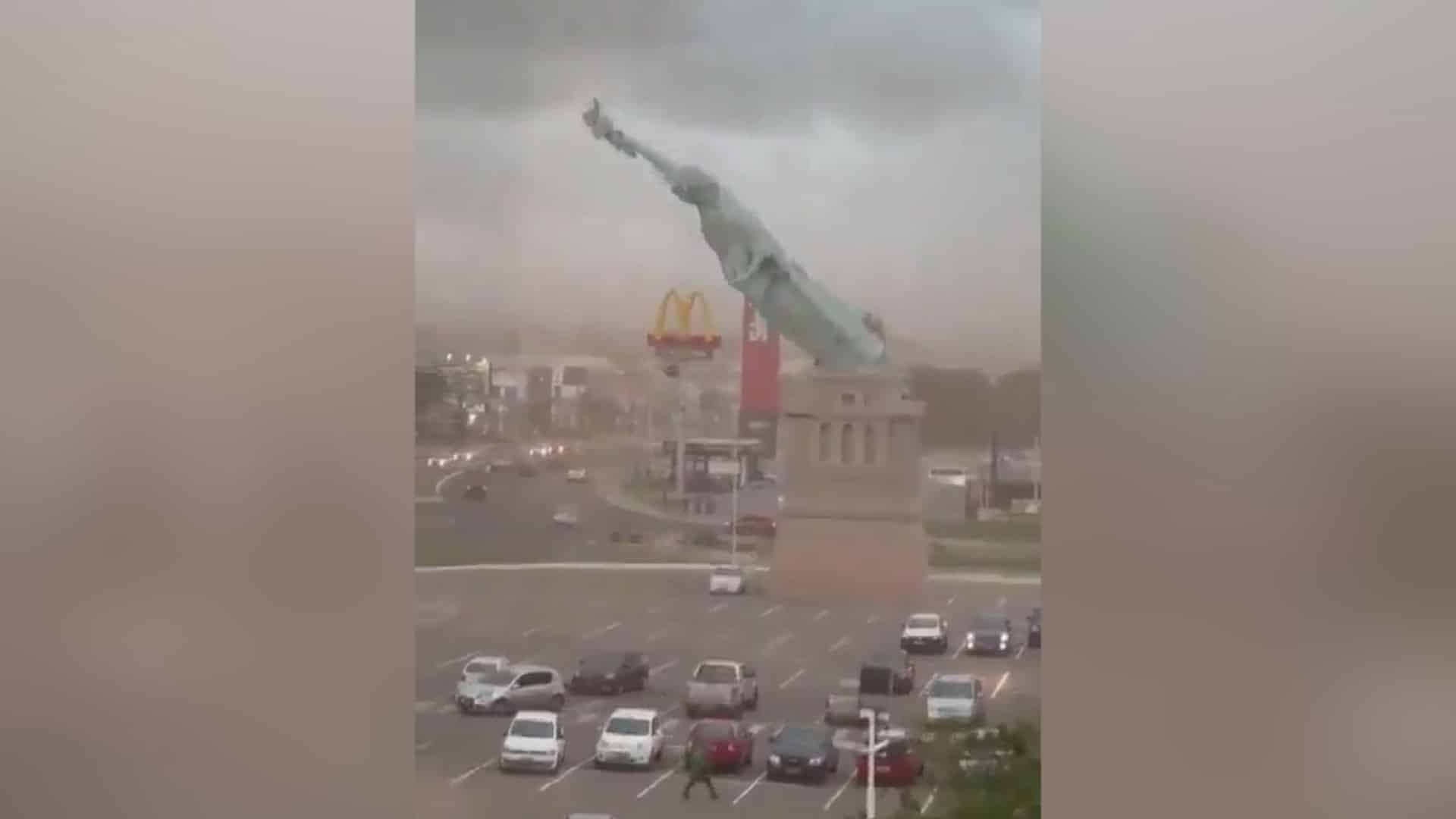 A Szabadság-szobor a világ egyik legismertebb jelképe, ezért a New York-i eredetinek számos másolata megtalálható szerte a világon. Egy ilyen másolatot a brazíliai Guaíba városában is meg lehetett csodálni. Hétfőn azonban a térségen erős viharok vonultak át, amelyeket helyenként akár 90 km/órás széllökések kísértek, a szobor pedig nem bírta a hatalmas terhelést. A széllökések ledöntötték a talapzatáról, és a 24 méter magas alkotás a földre zuhant. A drámai eset során szerencsére senki sem sérült meg.