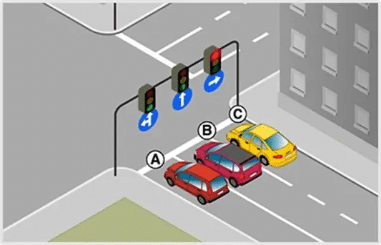 A C jelzésű citromsárga autónak valóban jobbra mutat a kötelező haladási irány tábla, azonban a lámpa piros jelzést mutat,. így nem kanyarodhat! Ebben a közlekedési helyzetben a sofőrnek a lámpát kell nézi elsőként és csak utána kell figyelembe vennie a táblát! A másik két autó az A és a B jelzésű pedig egyáltalán nem kanyarodhat jobbra, hiszen az ő kötelező haladási irányuk teljesen más irányba mutat. Ennek alapján a B jelzésű középső autó csak egyenesen haladhat tovább, míg az A jelzésű autó akár egyenesen is mehet tovább, vagy balra is kanyarodhat.