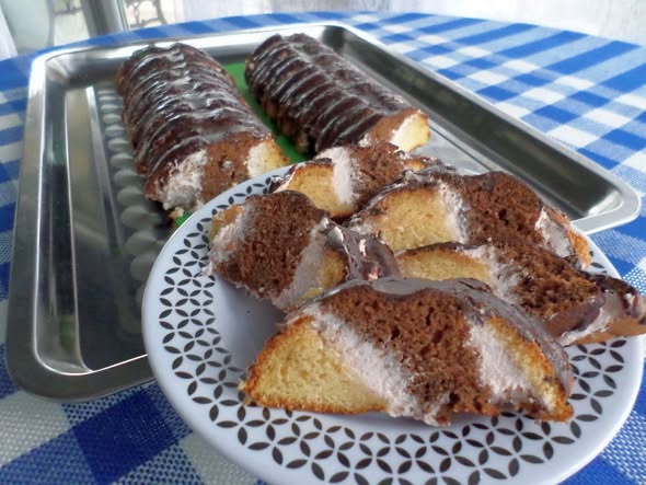 A méteres kalács kétféle piskótából készül, amelyeket ferdén szeletelve krémmel rétegezünk, így vágáskor jól látható a jellegzetes mintázat. A recept részletesen leírja, hogyan lehet könnyű, levegős tésztát sütni, és hogyan áll össze a krém és a máz úgy, hogy könnyen szeletelhető, ünnepi desszert legyen belőle.