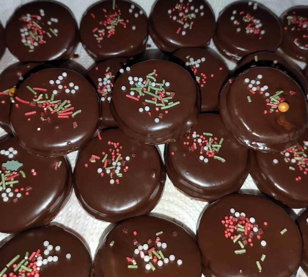 Miután teljesen kihűltek, elkészítem a csokibevonatot: az étcsokoládét az olajjal vízgőz felett felolvasztom, simára keverem, majd a kekszek tetejét vékony rétegben bevonom vele. Rácsra teszem őket, és hagyom, hogy a csokoládé szépen megdermedjen.