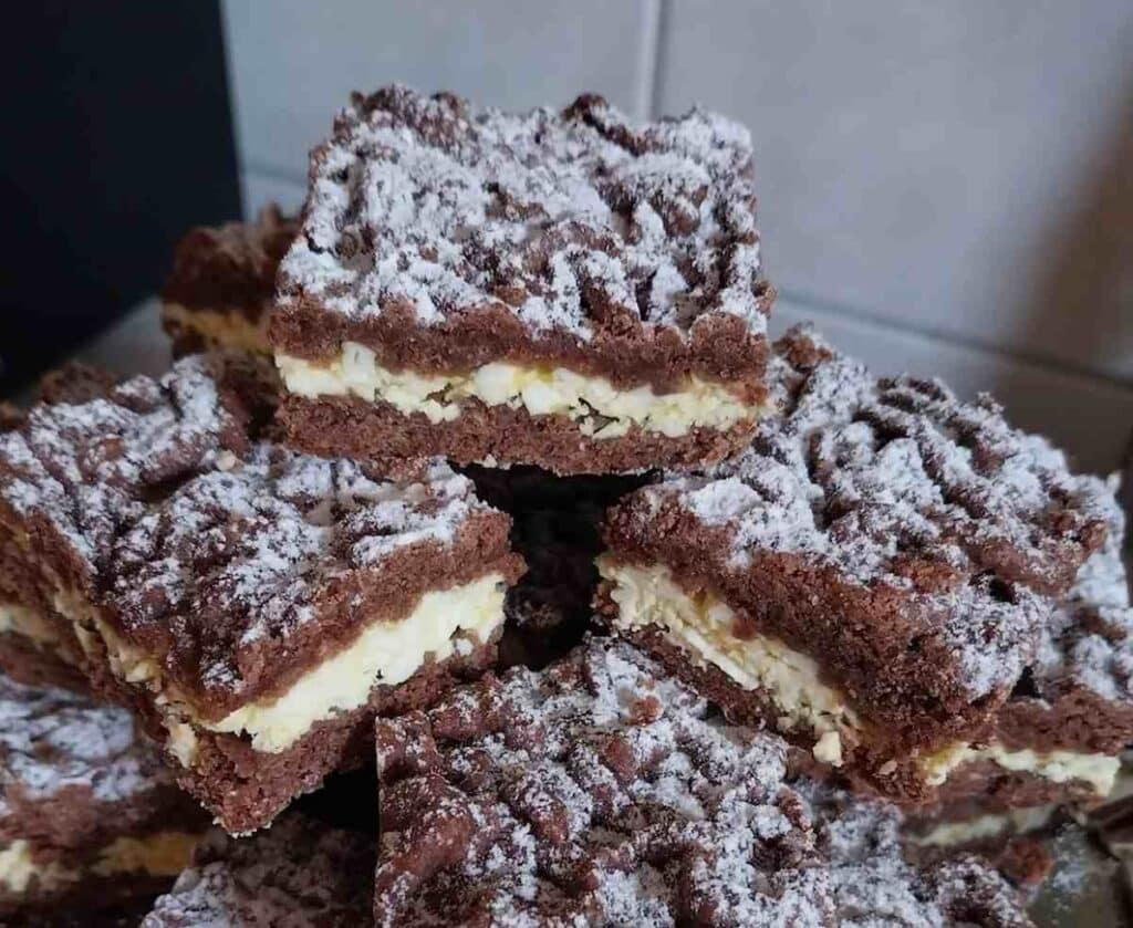 Ez az a fajta desszert, amely nem akar többnek látszani annál, ami. Kakaós tészta, krémes túrótöltelék, a tetején pedig az a bizonyos reszelt réteg, amitől az egész egyszerre rusztikus és ellenállhatatlan. Hidegen, langyosan, másnap reggel kávé mellé is ugyanúgy működik.